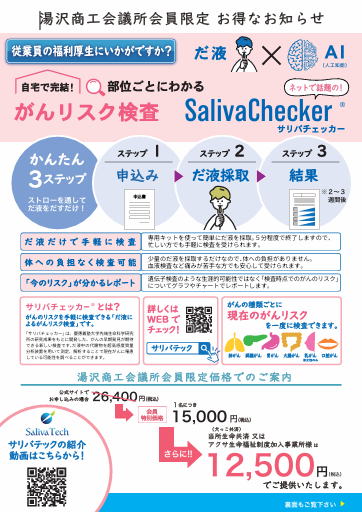【サリバチェッカーとは】 ●「今のリスク」がわかるレポート 【販売価格】 湯沢商工会議所会員特別価格 15,000円(税込) ★さらに、本所生命共済(犬っこ共済)またはアクサ生命福祉共済制度に加入の方は 12,500円(税込) 【お申込み方法】 以下のいずれかの方法でお申込みをお願いいたします。 ①Googleのお申込みフォームからご利用者1名ずつをご登録いただく方法。 お申込みフォーム(https://forms.gle/MdFDfzPVXHsRBaLo7) ②Excelのお申込みシートに事前入力し、Googleフォームにアップロードする方法。 ※ご利用者が複数名の場合はExcelシートでのお申込みがおすすめです。 お申込みシート(ExcelSheet.xlsm)→お申込みフォーム(https://forms.gle/MdFDfzPVXHsRBaLo7) ③チラシの購入申込書をご記入いただき、当所にFAXをお送りください。 ご利用者情報については担当者からご連絡いたします。 (チラシPDF)